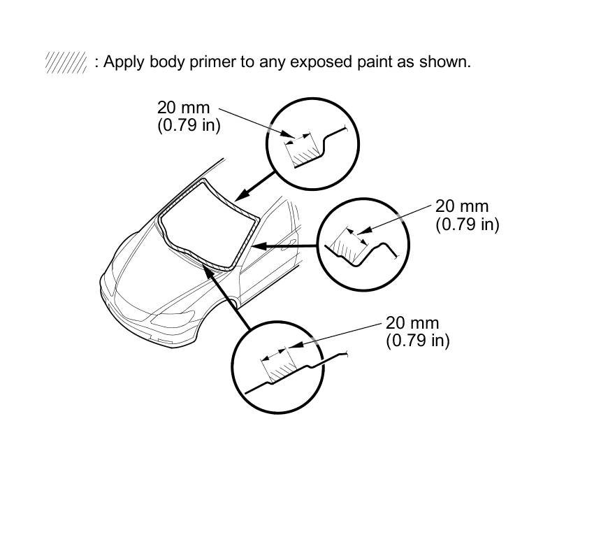 - Never touch the primed surfaces with your hands. If you do, the adhesive may not bond to the windshield properly, causing a leak after the windshield is installed.