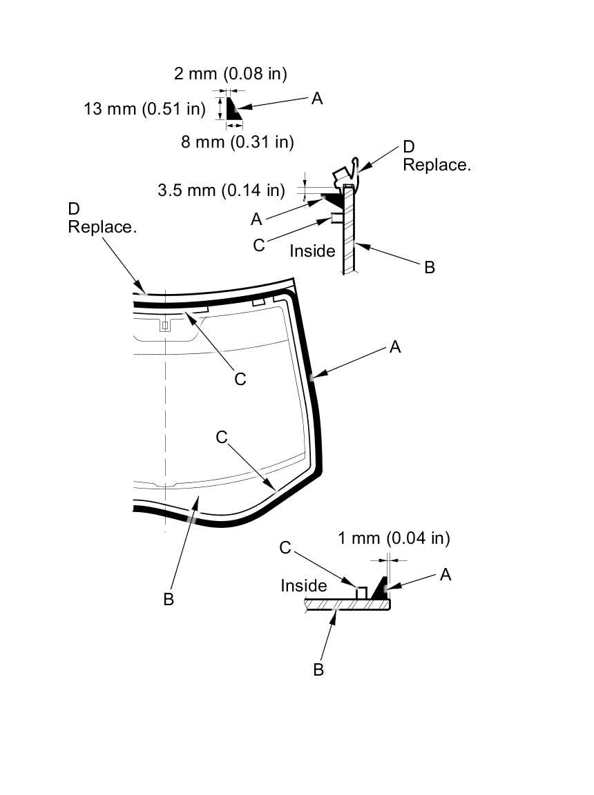 19. Put the cartridge in a caulking gun, and run a continuous bead of the adhesive (A) around the windshield (B) along the edge of the rubber dams (C) and the windshield molding (D) as shown.