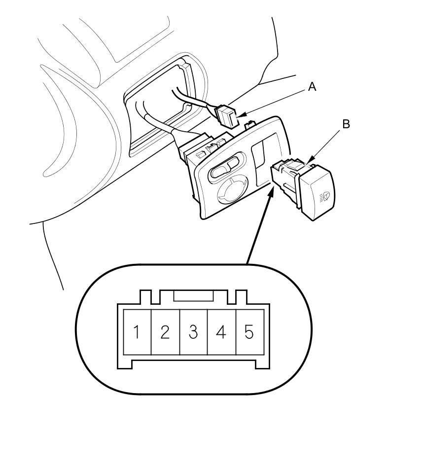 2. Disconnect the 5P connector (A) from the headlight washer switch (B).