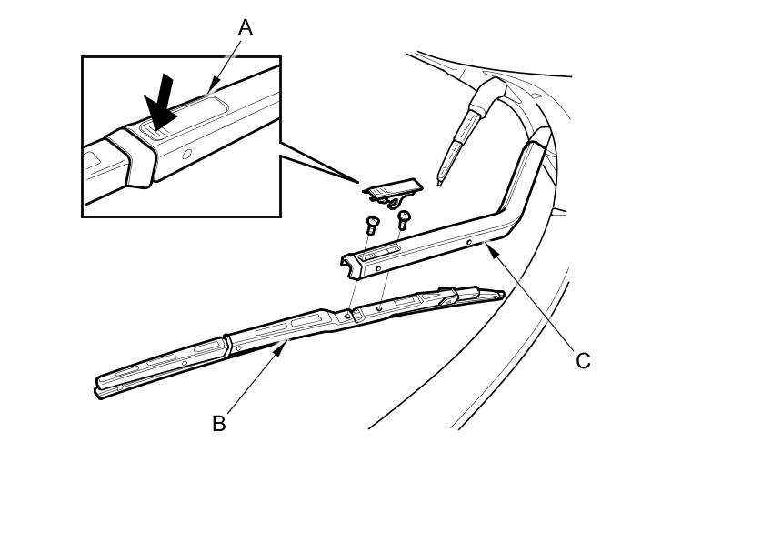 3. Disconnect the blade assembly (B) from the wiper arm (C) by removing the two screws from the arm.