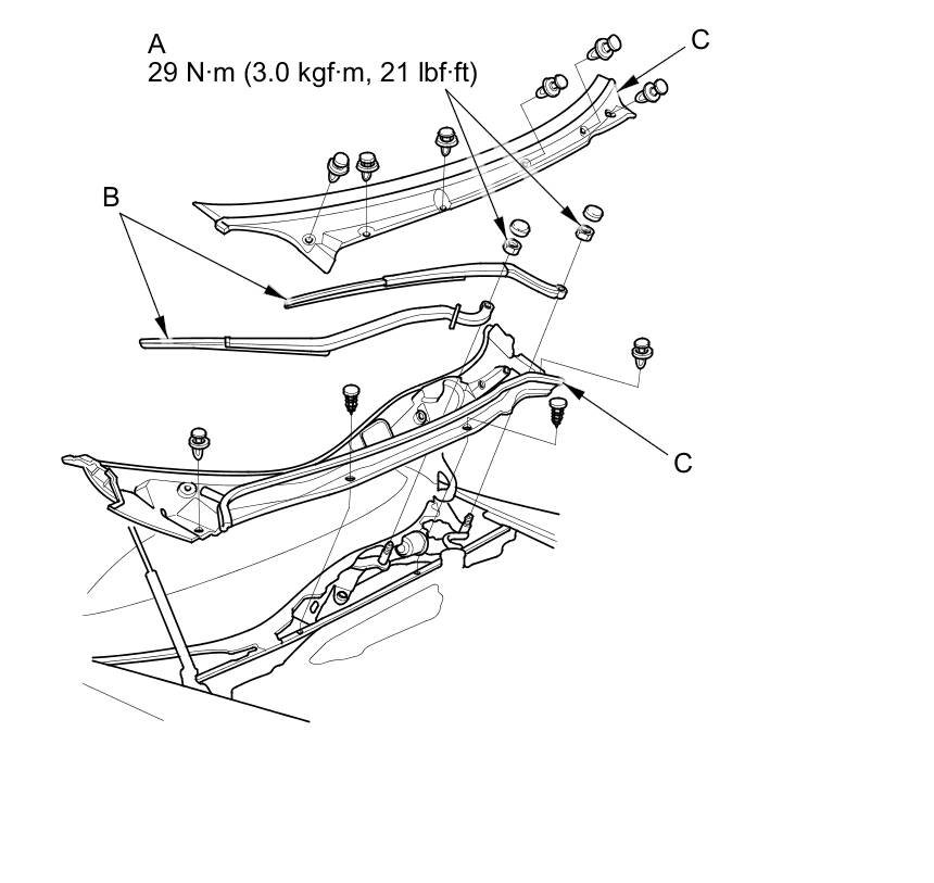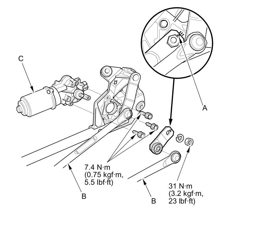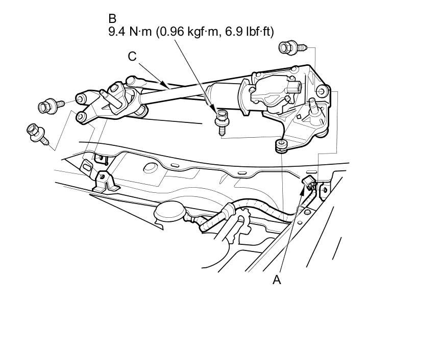 Separate the windshield wiper linkage (B) from the wiper motor (C).
