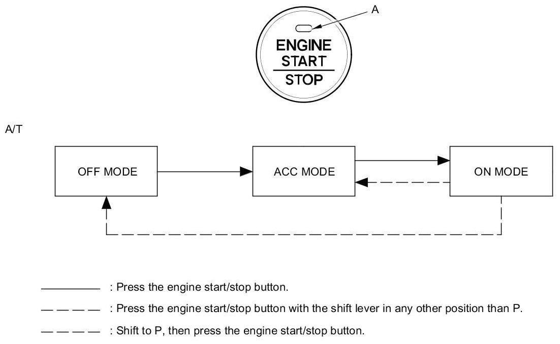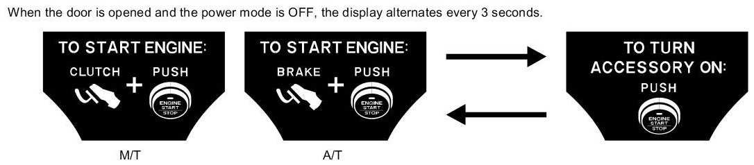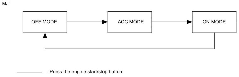 The keyless access system has four power modes: OFF, ACC, ON, and START. The power modes can be changed by pressing the engine start/stop button. The power mode changes to START mode any time the engine start/stop button is pressed while also pressing the brake pedal (A/T) or clutch pedal (M/T).