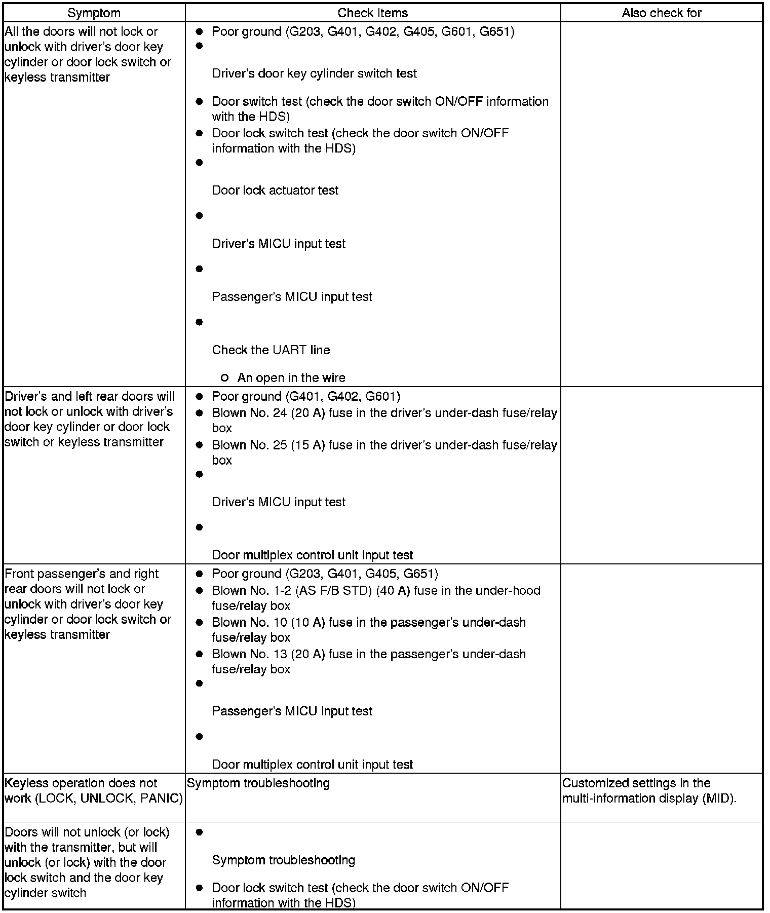 - If the door lock system and the keyless operation do not work, troubleshoot the door locks first.