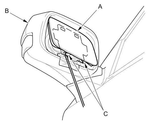3. Carefully pull out the bottom edge of the mirror holder (A) to separate the adhesive (B), and then release the side clips (C).