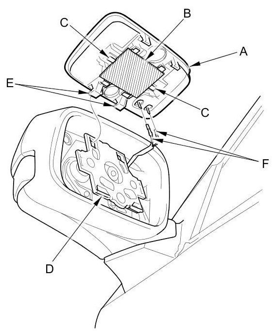 4. Separate the mirror holder from the inner holder (D) on the actuator by releasing the hooks (E), and disconnect the mirror defogger connectors (F).