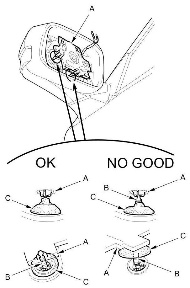 5. Before reinstalling the mirror holder to the inner holder (A) on the actuator, check the actuator rods (B) and the actuator boots (C).