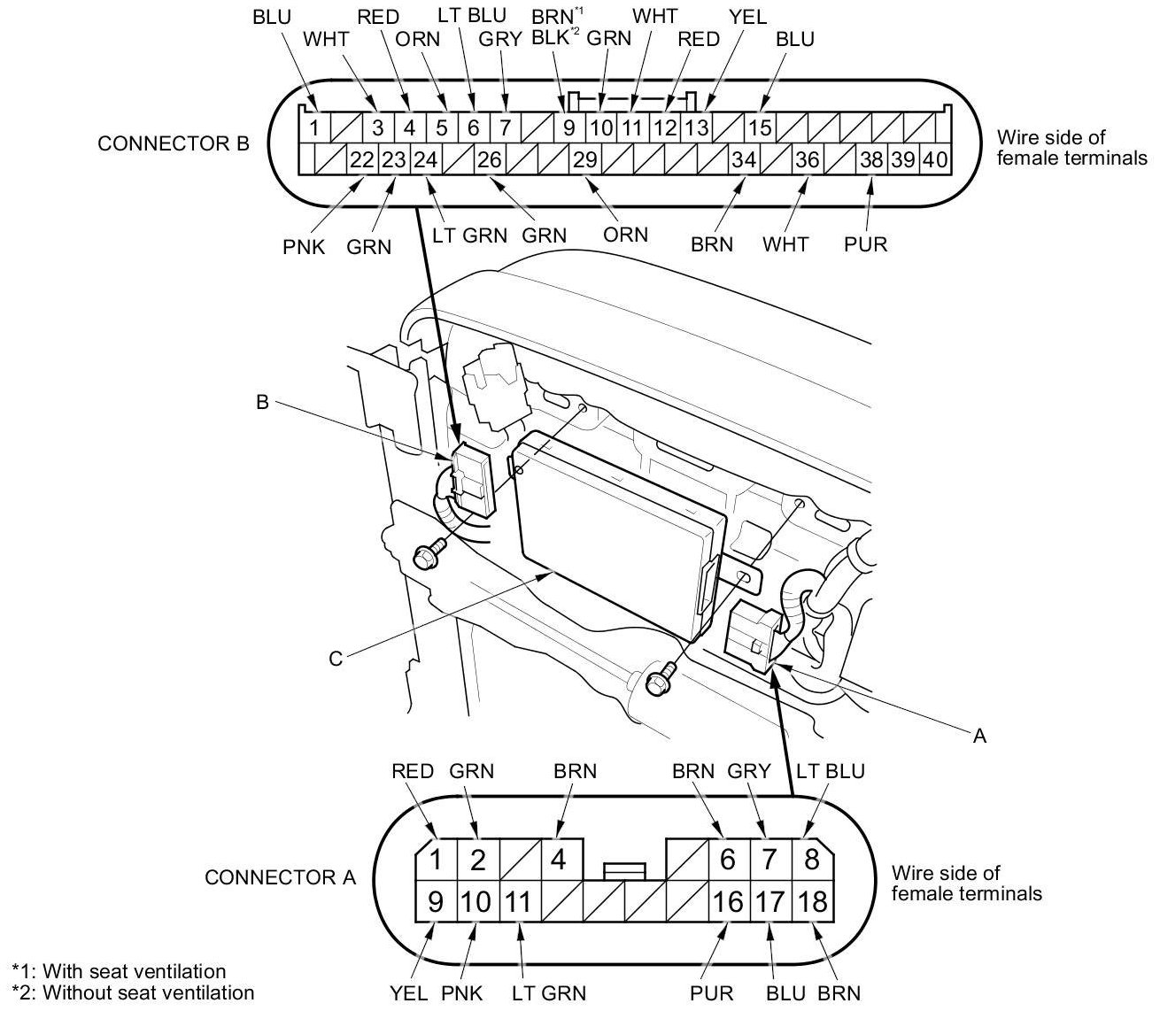 3. Disconnect the 18P connector (A) and 40P connector (B) from the power seat control unit (C).