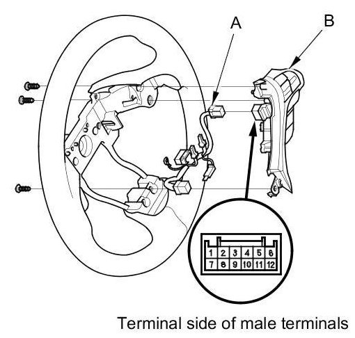 3. Disconnect the cable real subharness connector (A), then remove the steering wheel trim/cruise control combination switch (B).