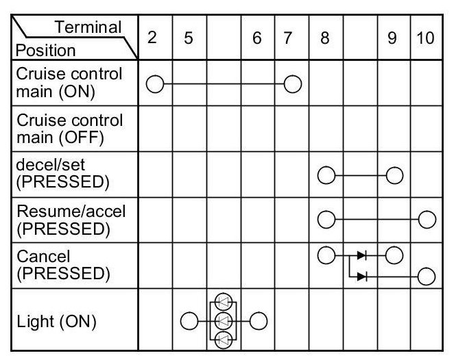 4. Check for continuity between the terminals in each cruise control combination switch position according to the table:
