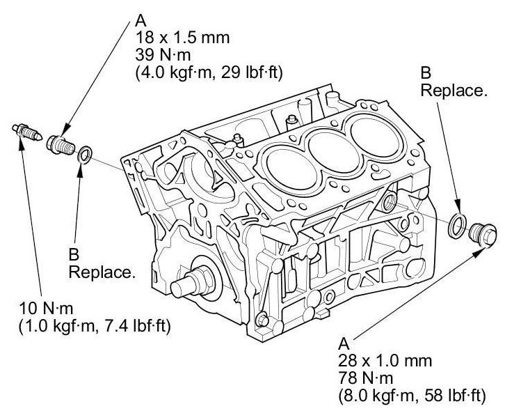 NOTE: When installing the sealing bolts (A), always use new washers (B).