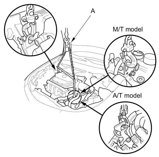 2. Position the engine/transmission under the vehicle. Be sure that they are properly aligned. Carefully lower the vehicle until the engine/transmission are properly positioned in the engine compartment. Make sure the vehicle is not resting on any part of the engine/transmission. Support the engine/transmission with a chain hoist (A) and carefully raise the engine/transmission into place.