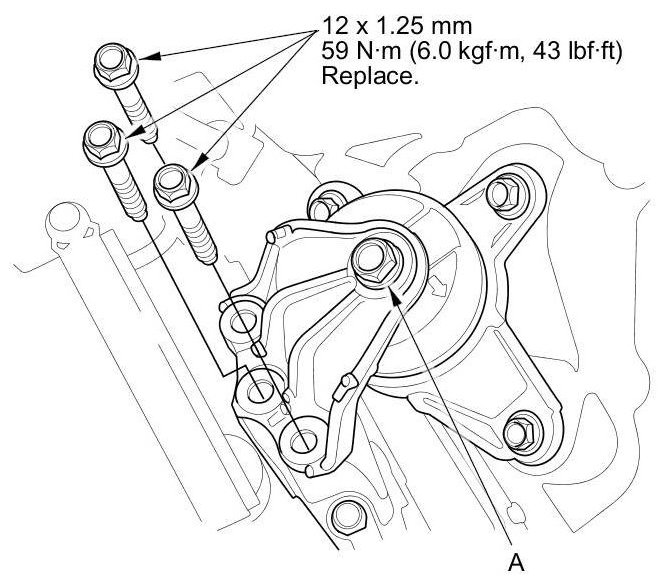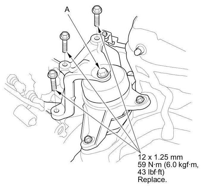 NOTE: If bolt (A) was removed by mistake during removal, the upper transmission mount bracket must be replaced as an assembly.