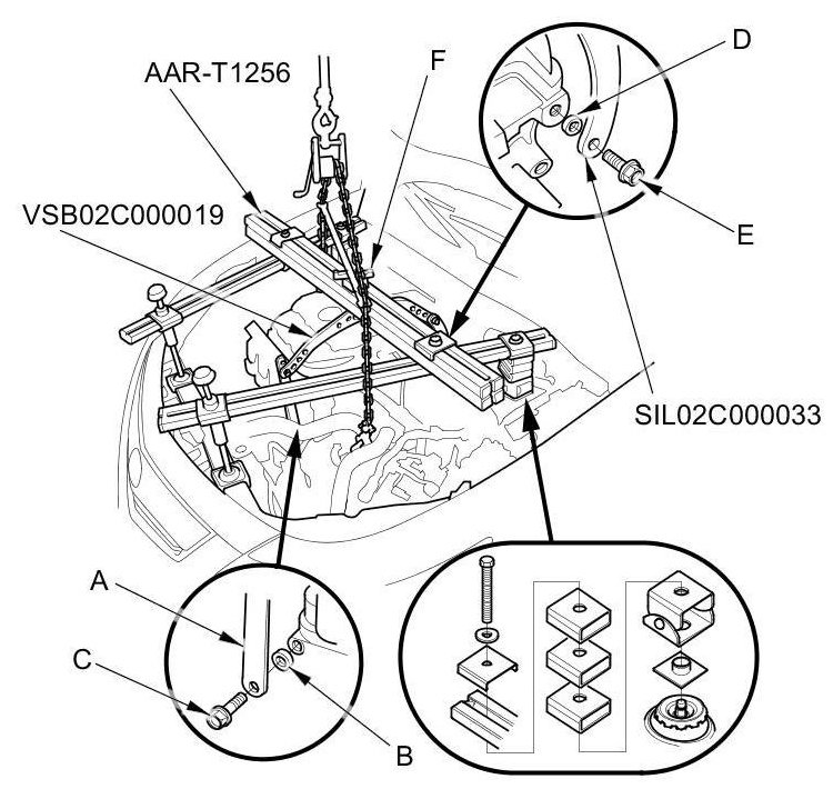 6. Install the engine support hanger (AAR-T1256) onto the vehicle as shown, and attach the hook to the slotted hole in the engine hanger balance bar. Tighten the wing nut (F) by hand, and lift and support the engine/transmission.