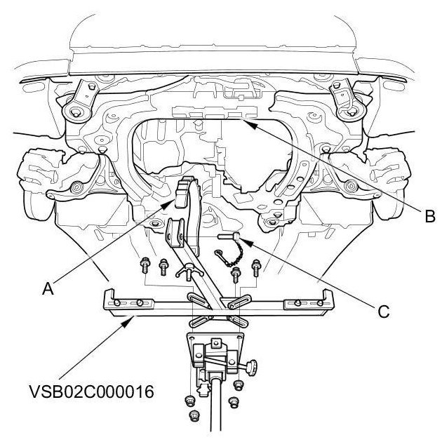 8. Attach the subframe adapter (VSB02C000016) to the subframe by looping the belt (A) over the front of the front subframe (B), then secure the belt with its stop (C).
