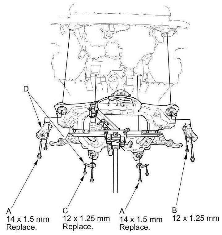 10. Loosely install the new subframe mounting bolts (four) (A), the 12 x 1.25 mm bolts (two) (B), the new 12 x 1.25 mm (two) (C), and the stiffeners (D).