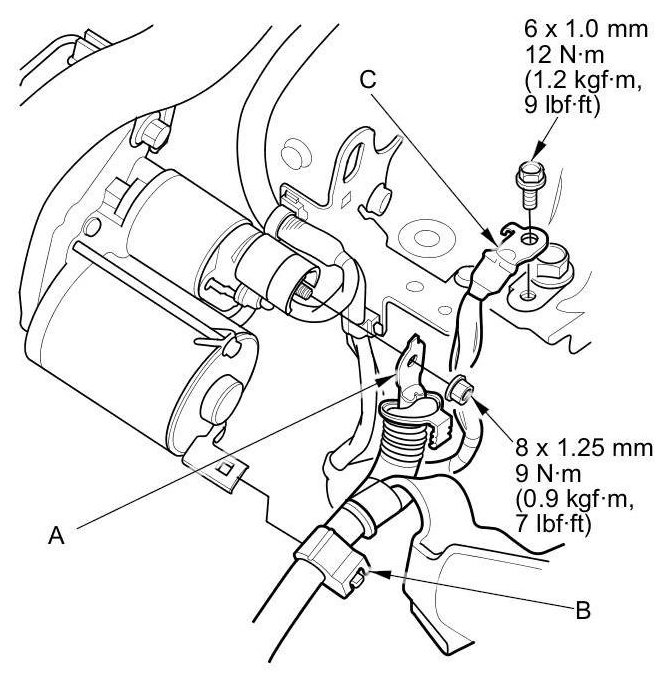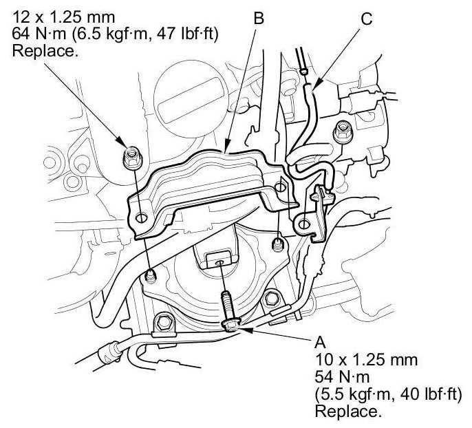 19. A/T model: Tighten the new front engine mount bolt (A), then install the front engine mount stop (B) and connect the vacuum hose (C).