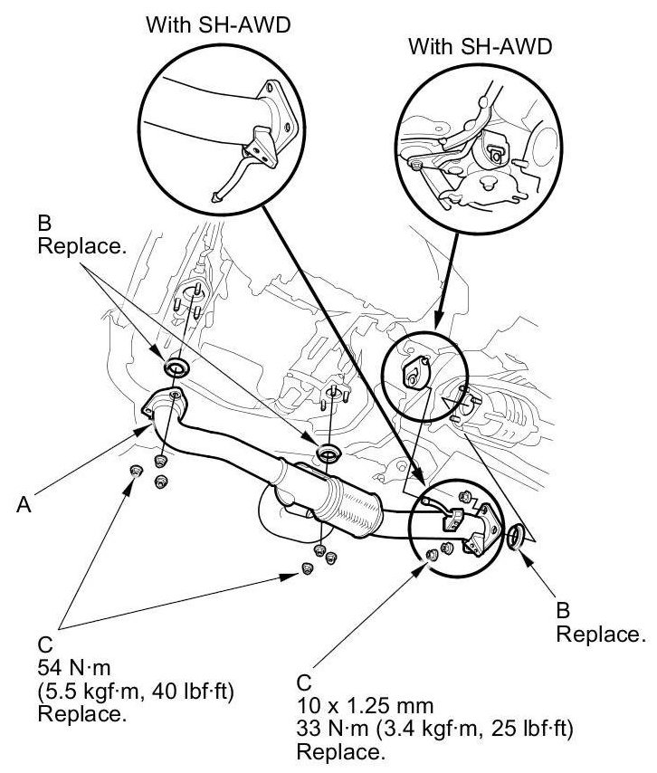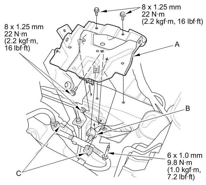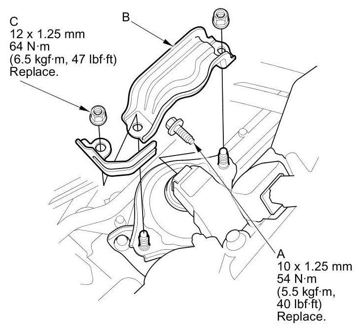21. A/T model: Tighten the new rear engine mount bolt (A), then install the rear engine mount stop (B) using new nuts (C).