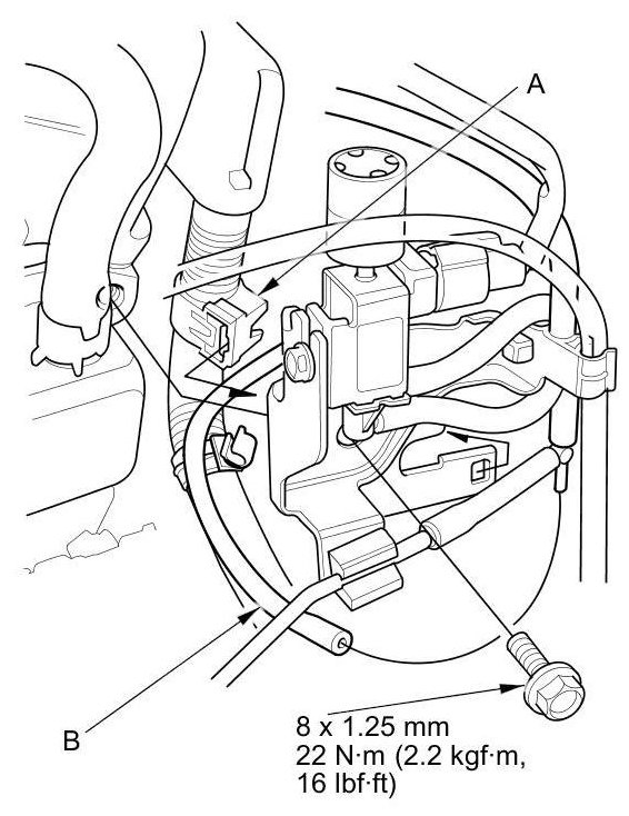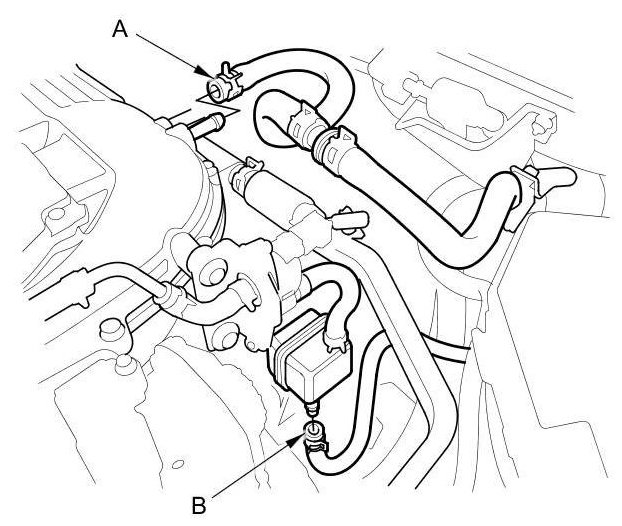 26. A/T model: Connect the vacuum hose (B).
