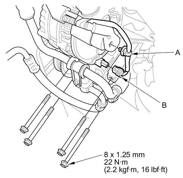 27. Install the A/C compressor, then install the harness clamp (A) and connect the A/C compressor clutch connector (B).