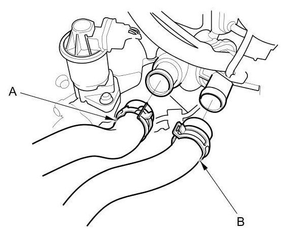 30. Connect the upper radiator hose (A) and the lower radiator hose (B).