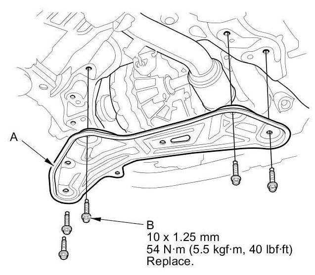 36. Install the front subframe stiffener (A) using new bolts (B).