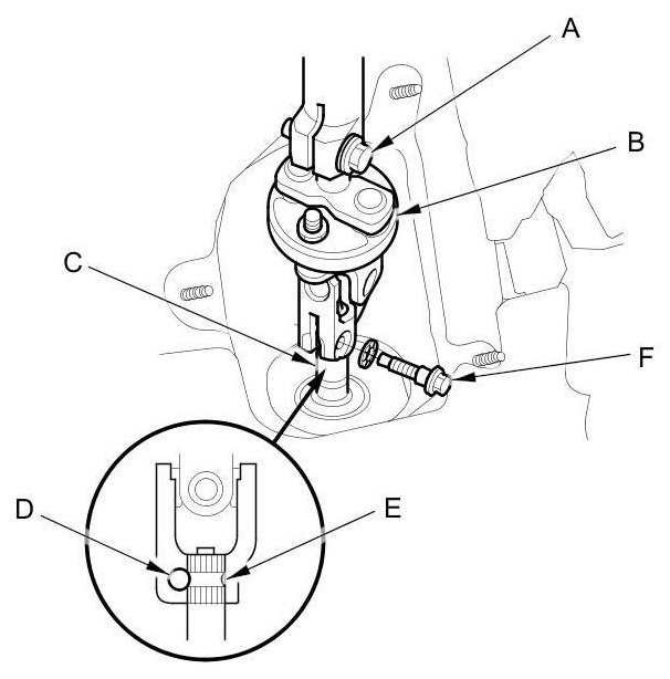 45. Align the bolt hole (D) on the steering joint with the groove (E) around the pinion shaft, then loosely install the lower steering joint bolt (F). Be sure that the joint bolt is securely in the groove in the pinion shaft.
