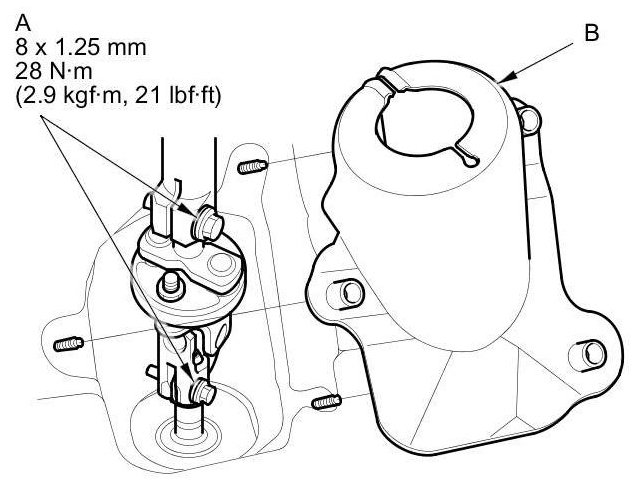 61. M/T model: Connect the positive starter cable (A), then install the harness clamp (B). Make sure the crimped side of the ring terminal face away from the starter when you connect it.
