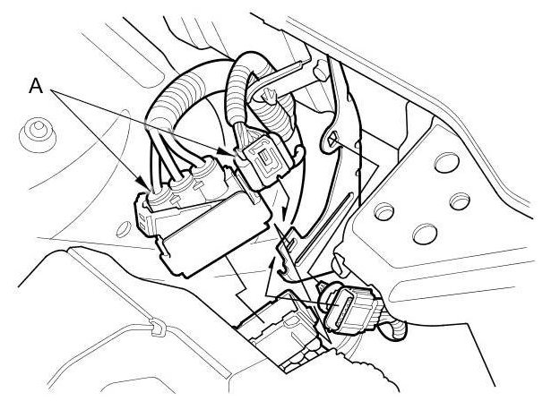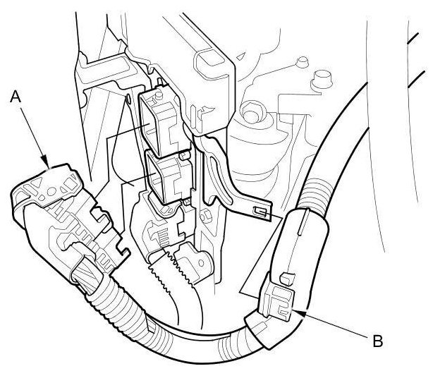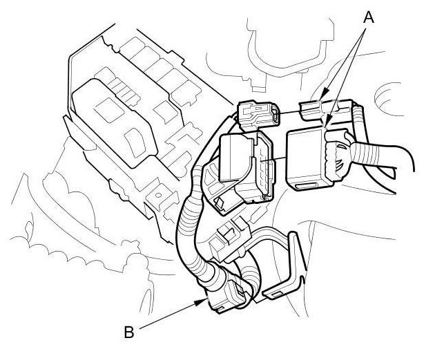 57. Connect the harness connectors (A), then install the harness clamp (B).