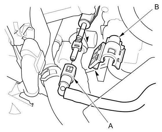 54. Connect the brake booster vacuum hose (A) and the EVAP canister hose (B).