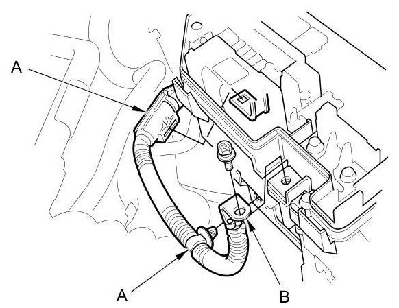 63. A/T model: Connect the positive starter cable (A), then install the harness clamps (B). Make sure the crimped side of the ring terminal face away from the starter when you connect it.