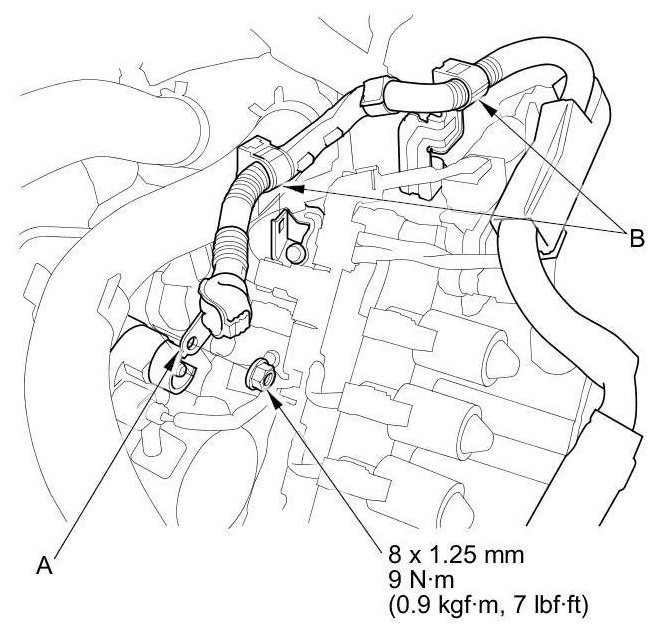 15. A/T model: Install the ground cable (B).