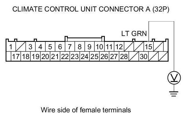 4. Measure the voltage between climate control unit connector A (32P) terminal No. 15 and body ground.