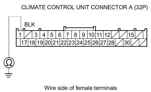 6. Check for continuity between climate control unit connector A (32P) terminal No. 1 and body ground.