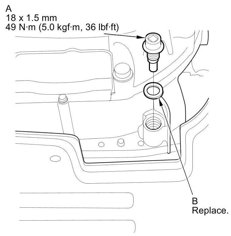 5. Reinstall the drain plug with a new sealing washer (B).