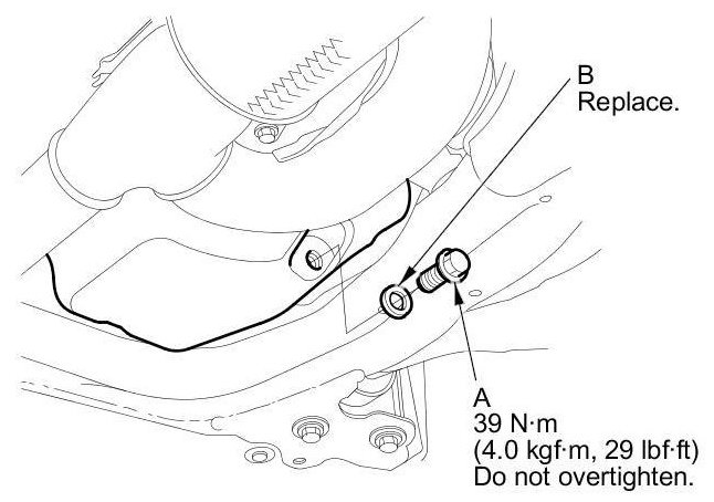 3. Reinstall the drain bolt with a new washer (B) and torque to specification.