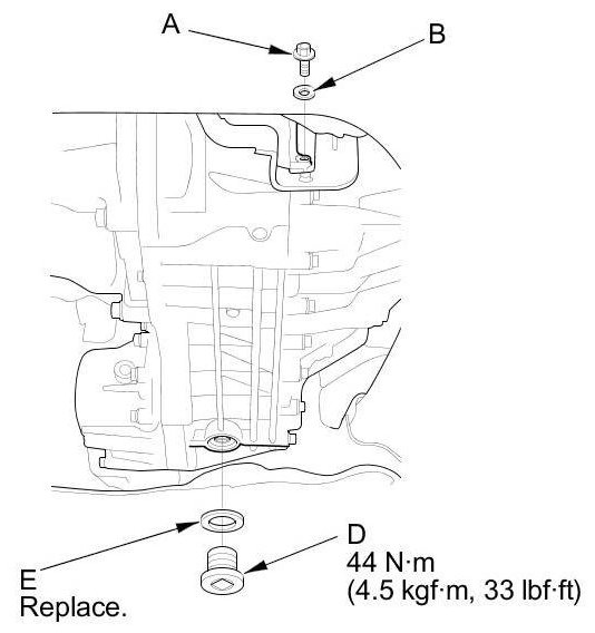 4. If the fluid is dirty, remove the drain plug (D) and the sealing washer (E), and drain the MTF.
