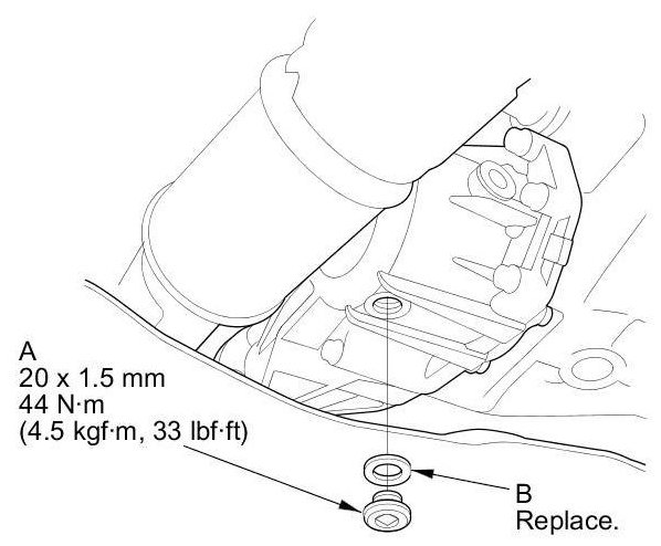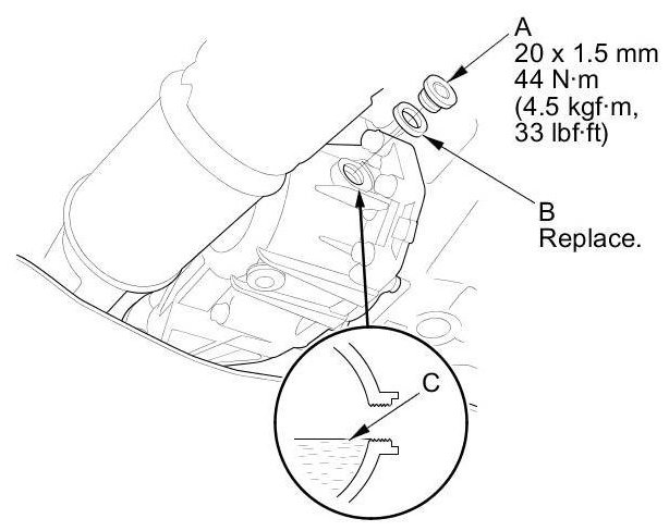 2. Remove the filler plug (A) and the sealing washer (B), check the condition of the transfer fluid, and make sure it is at the proper level (C).