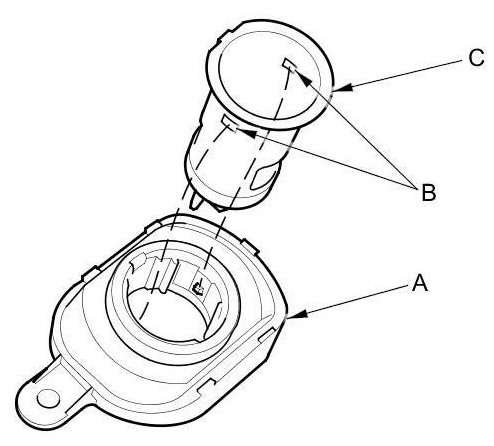 10. Remove the housing (A) from the socket base (B). Note the location of the indexing tabs (C).
