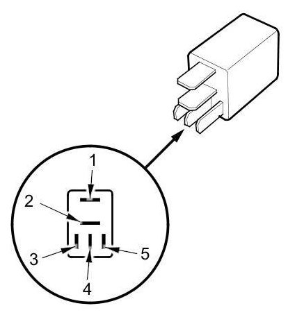 - There should be continuity between terminals No. 1 and No. 2 when battery power is connected to terminal No. 5, and body ground is connected to terminal No. 3.