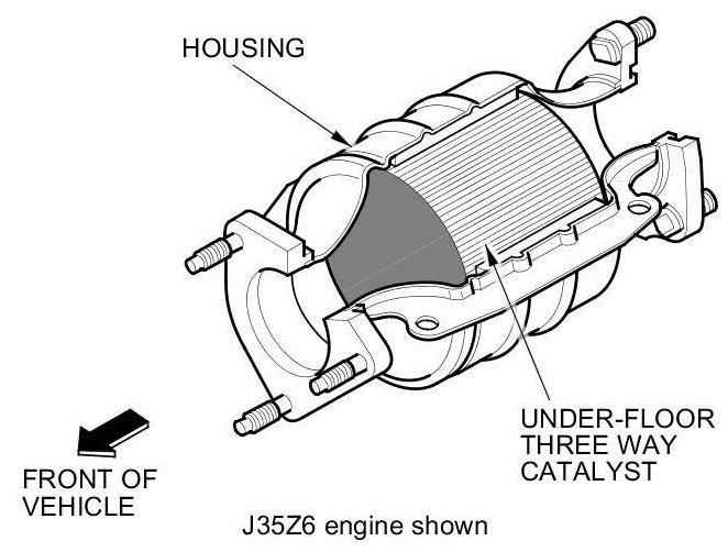 The WU-TWC/Under-floor TWC converts hydrocarbons (HC), carbon monoxide (CO), and oxides of nitrogen (NOx) in the exhaust gas to carbon dioxide (CO2), nitrogen (N2), and water vapor.