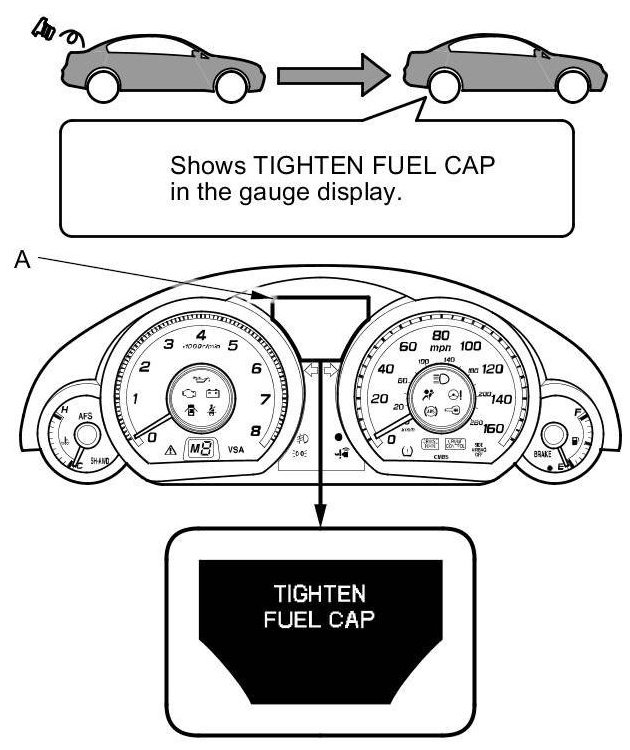 The first time a leak is detected a TIGHTEN FUEL CAP message appears on the gauge display (A). To scroll to another message, press the select/reset button. The "TIGHTEN FUEL CAP" message appears each time you restart the engine until the system turns the message off. Turn the engine off, then replace or tighten the fuel fill cap until it clicks at least once.