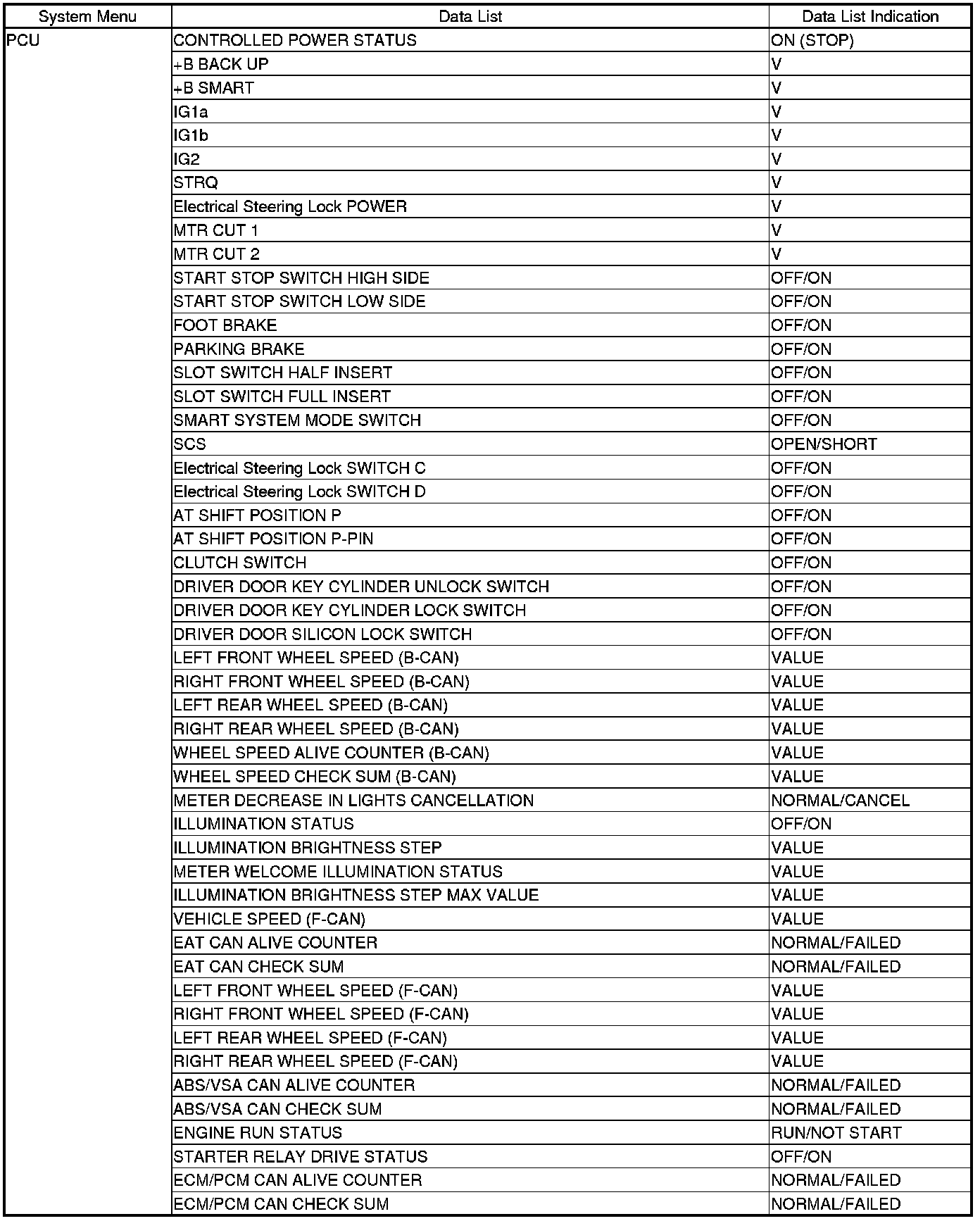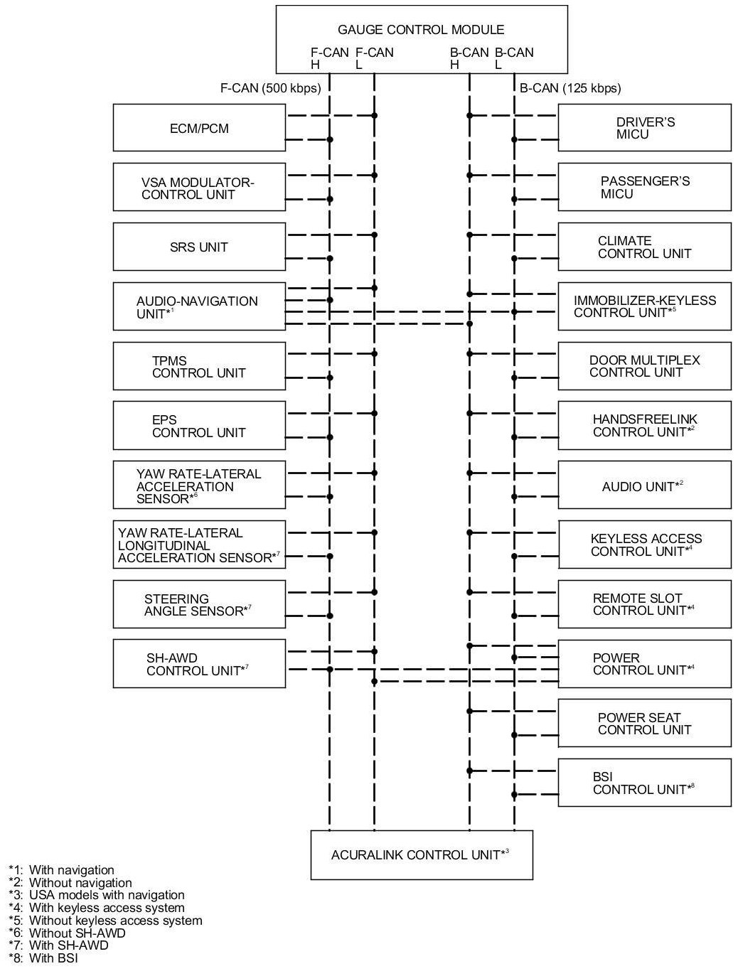 The body controller area network (B-CAN) and the fast controller area network (F-CAN) share information between multiple electronic control units (ECUs). B-CAN communication moves at a slower speed (125 kbps) for convenience related items and for other functions. F-CAN information moves at a faster speed (500 kbps) for "real time" functions such as fuel and emissions data. To allow both systems to share information, the gauge control module translates and relays the information from B-CAN to F-CAN and from F-CAN to B-CAN. This is called the Gateway Function.