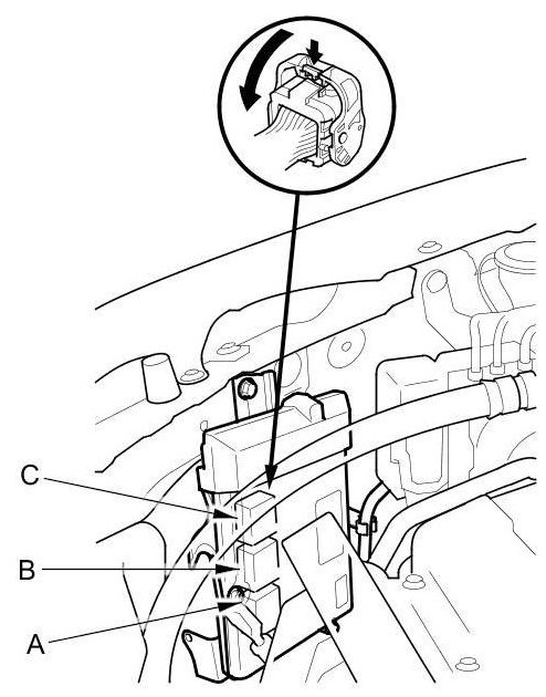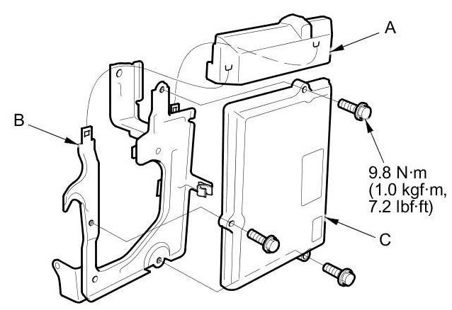 9. Remove the cover (A) and the bracket (B) from the ECM/PCM (C).