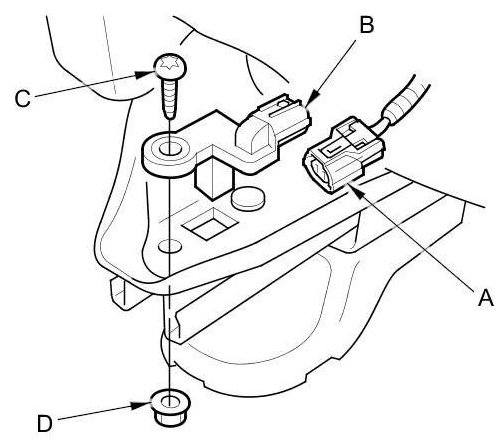 4. Remove the TORX bolt (C) and nut (D) using a TORX T30 bit, then remove the driver's seat position sensor.