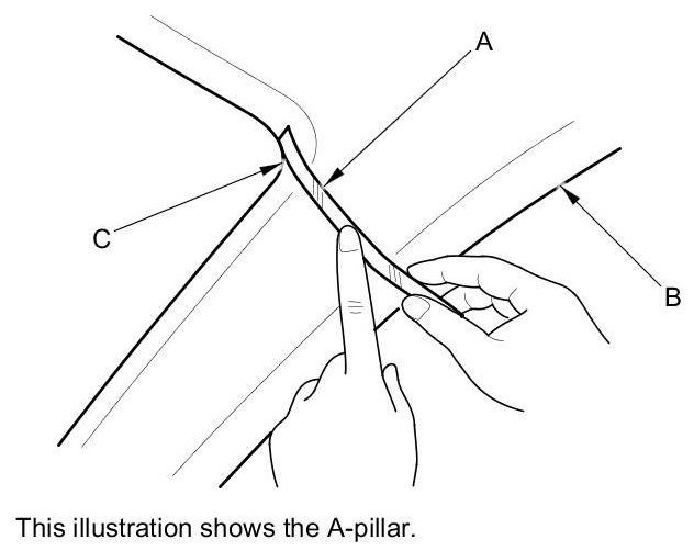 2. Apply masking tape (A) to the headliner (B) to mark the upper edge of the pillar trim (C).