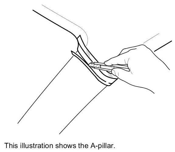 4. Carefully trim the headliner with a utility knife, reducing the overlap to less than 8 mm (0.3 in).