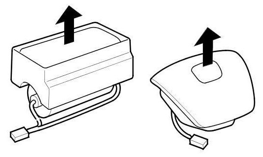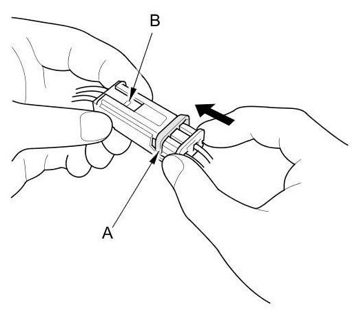 To reconnect, hold the pawl-side connector, and press on the back of the sleeve-side connector in the direction shown. As the two connector halves are pressed together, the sleeve (A) is pushed back by the pawl (B). Do not touch the sleeve.