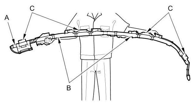 - The side curtain airbag module assembly is a long, jointed part containing an inflator (A), a flexible bag (B), and brackets (C). When removing or installing the side curtain airbag assembly, never: