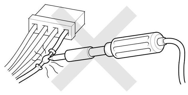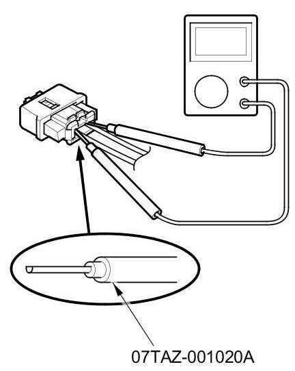 - When using electrical test equipment, insert the probe of the tester into the wire side of the connector (except SRS unit connectors and waterproof SRS connectors). Do not insert the probe of the tester into the terminal side of the connector, and do not tamper with the connector.