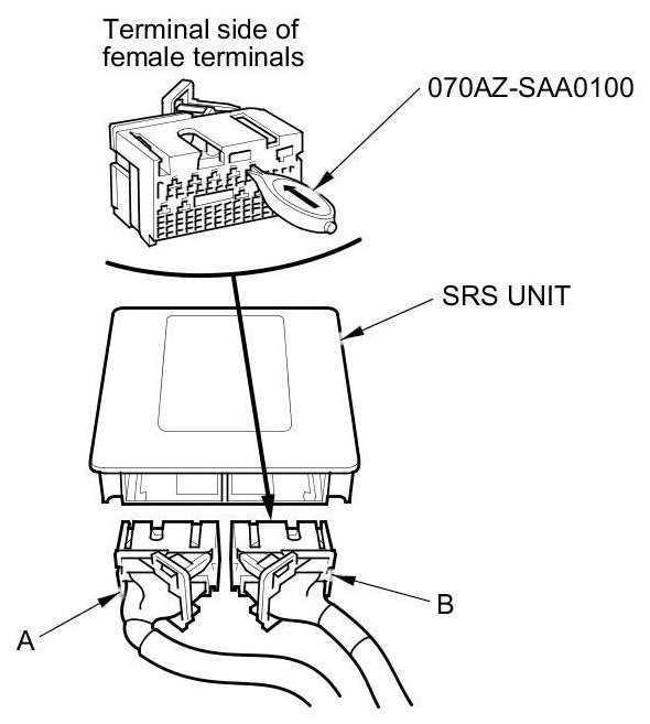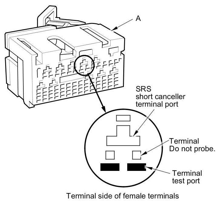 When diagnosing or troubleshooting at an SRS unit connector (A), use the terminal test port below the terminal you need to check. Gently insert the pin probes of the tester or jumper wire at the terminal test port from the terminal side.